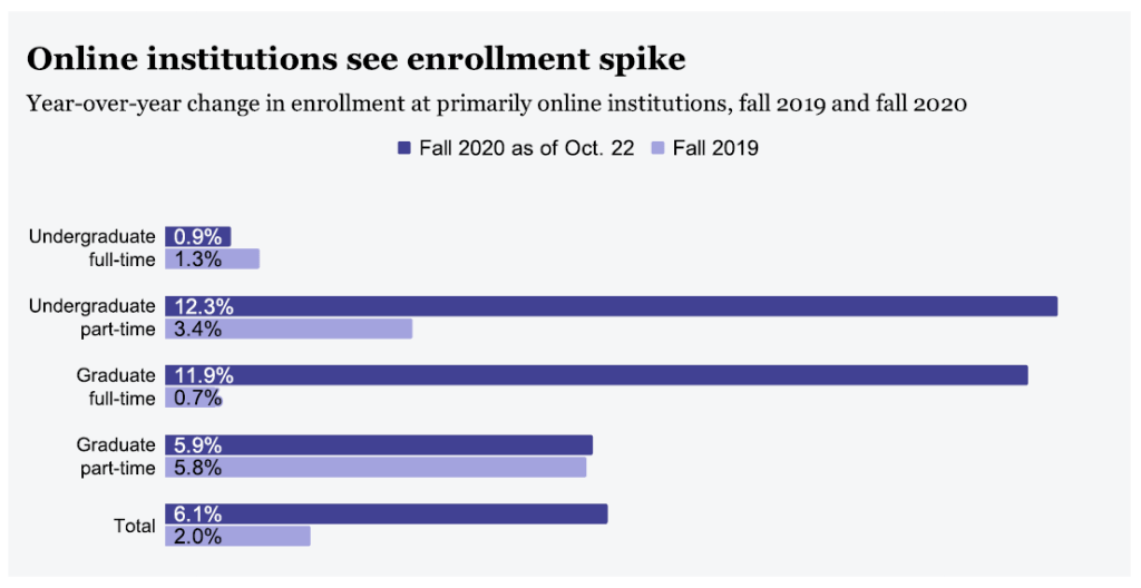 With much of the country moving to online, remote, virtual, or hybrid learning, online programs have been the only ones that have seen an increase in enrollment. According to this article from Higher Ed Dive, overall enrollment in online programs has increased by nearly 6%, and some programs have increased by well over 10%.