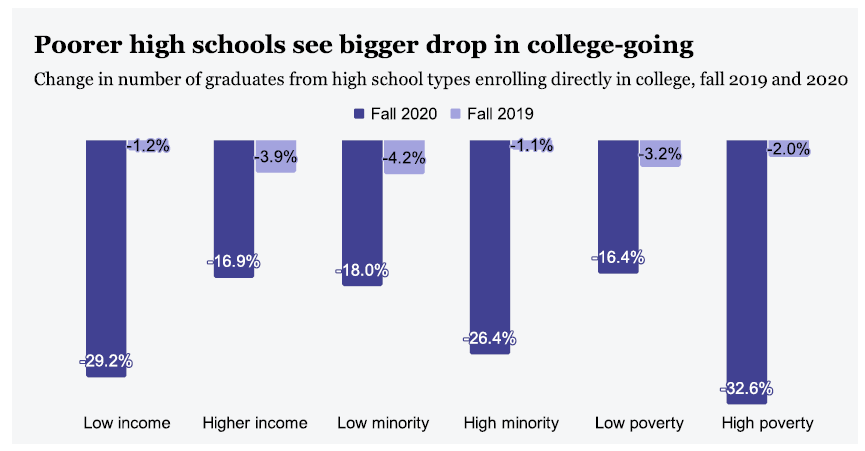Covid-19 has affected low-income and minority students the most. According to an Inside Higher Ed article from Dec. 2020, low-income and minority students in community colleges have been “cancelling their plans” or are planning to take fewer courses. The article reports that 40% of students were planning to drop all of their courses for Spring, and another 15% will be taking fewer courses. Low-income students were twice as likely to change plans as higher-income students.