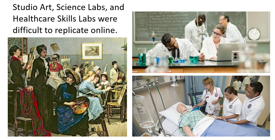 Some instructors even felt safe because their classroom or academic program could not be moved to the online environment. My university had a new, state-of-the-art science building, and it was a major attraction for students in science and healthcare fields. They enjoyed the hands-on, experiential learning, and my university had become known for this kind of learning. Fine arts classrooms in pottery, drawing-painting, sculpture, music, and also high-tech classrooms for digital music production and graphic design also depended on the expensive technology and recording studios that could not be replicated in the online environment.