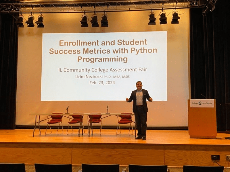 In 2023, I participated in the Grand Challenges in Assessment, which is a national collaboration of assessment practitioners to promote scholarship and resources in assessment, and I have attended and presented at the Illinois Community College Assessment Fair. In Spring 2024, I gave a presentation at the Assessment Fair about my Master’s Practicum project that analyzed student enrollment and success data using Python programming.