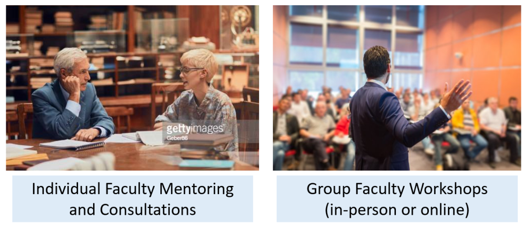 I can also host group workshops (in-person or online) to faculty development committees and academic departments in the areas of online pedagogy, classroom teaching, and student engagement. Please also see my consulting services page for information about consulting services in academic assessment and accreditation, higher education administration, service-learning, and development of academic programs.